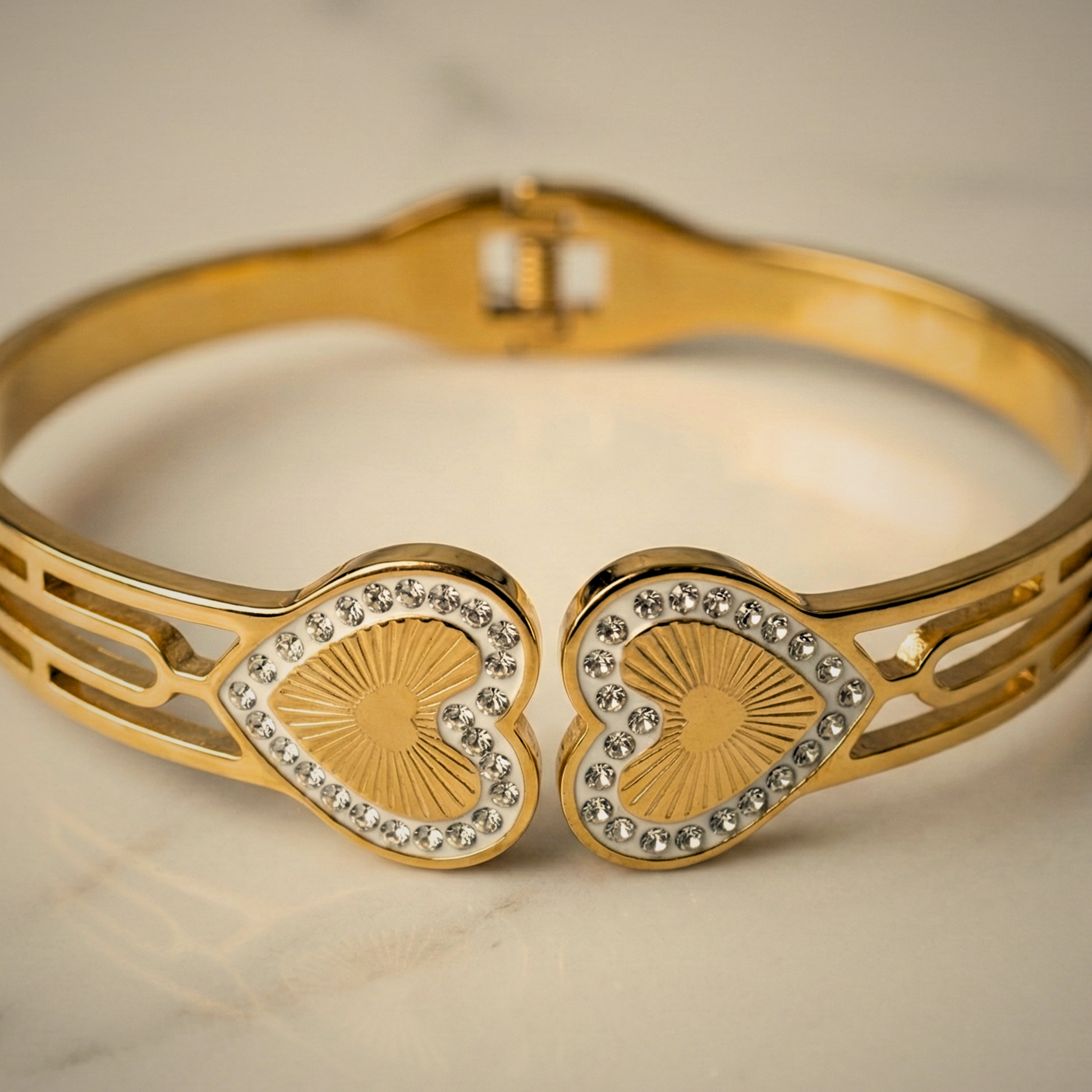 A graceful dual-heart bracelet accented with subtle sparkle, symbolizing connection and love. Crafted with anti-tarnish, waterproof coating to keep its brilliance intact over time.